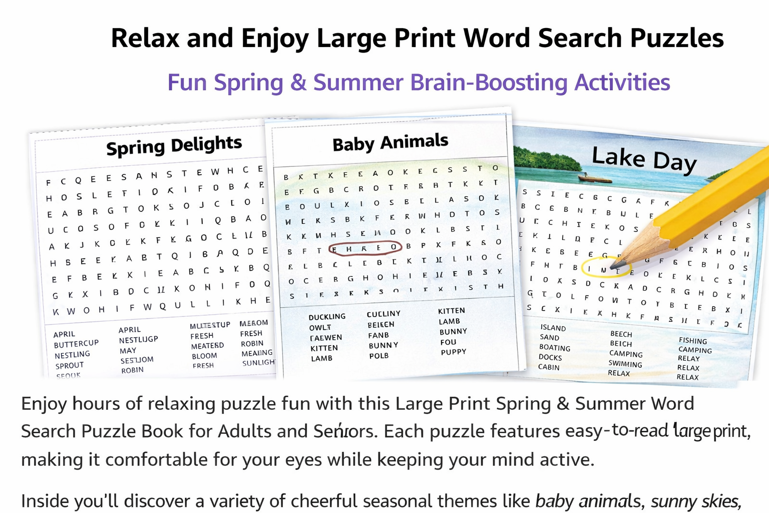 Whether you're enjoying a quiet afternoon at home, traveling, or relaxing on vacation, this Large Print Spring & Summer Word Search Book for Adults & Seniors is a wonderful way to keep your mind active while having fun.